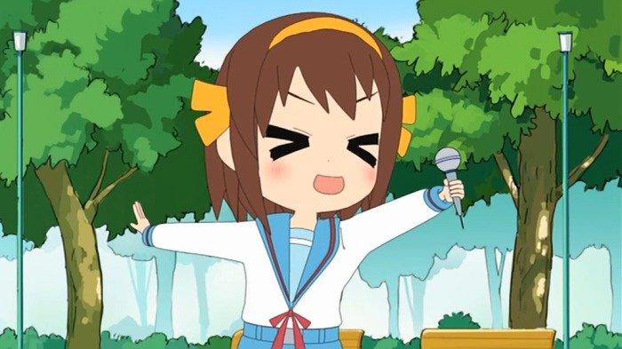 Комедийный спин-офф самого популярного сериала 2006-го года, «Меланхолии Харухи Судзумии».Присутствуют все главные герои, только слегка "измененные". Скажем Нагато теперь увлекается эроге, в доме у неё живёт резервная копия Асакуры-сан вместе с зёленым надувным псом, у Асахины-сан теперь есть ручной лев, Цуруя ищет возможности подраться с Мори и многое-многое другое...
