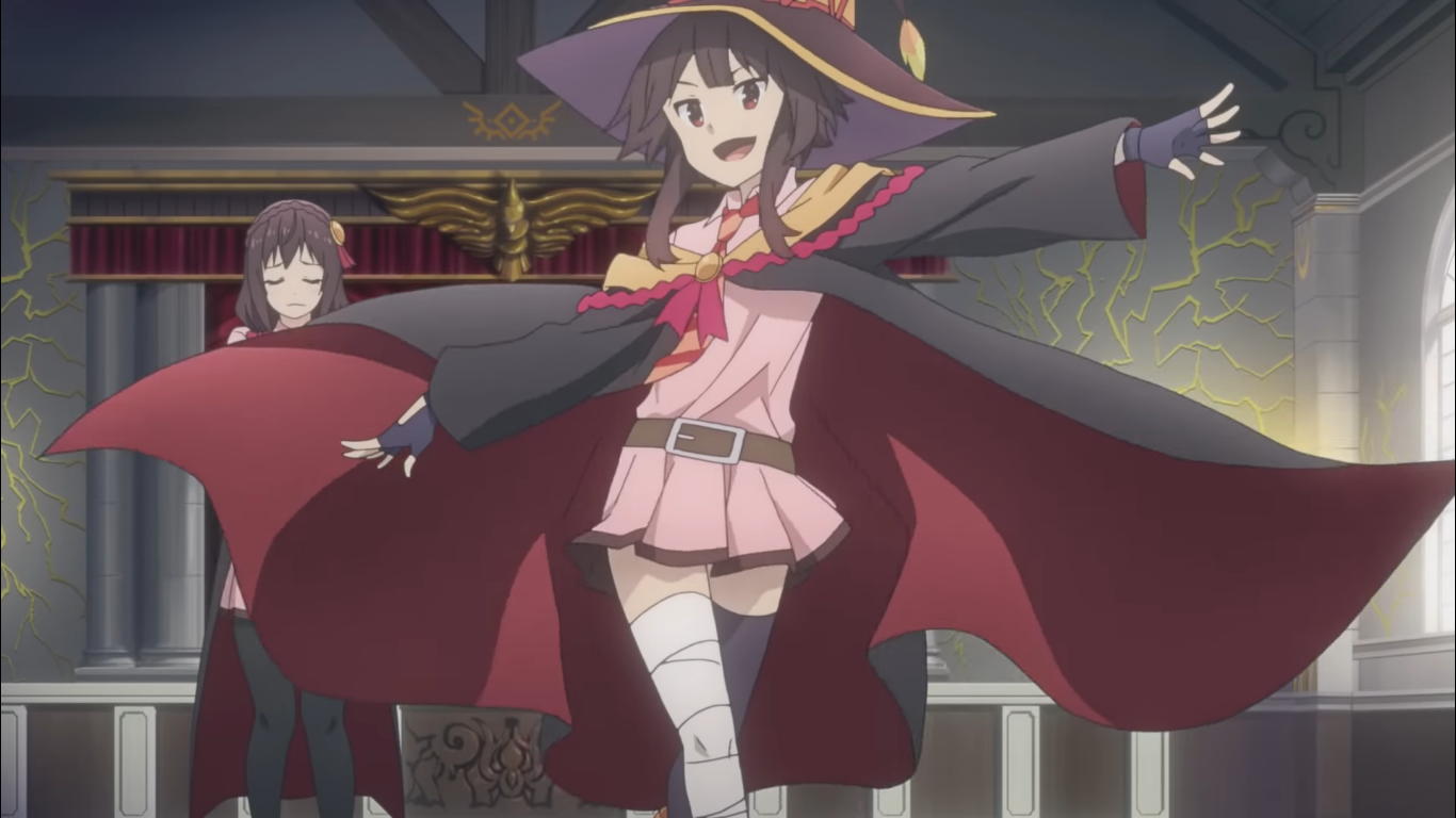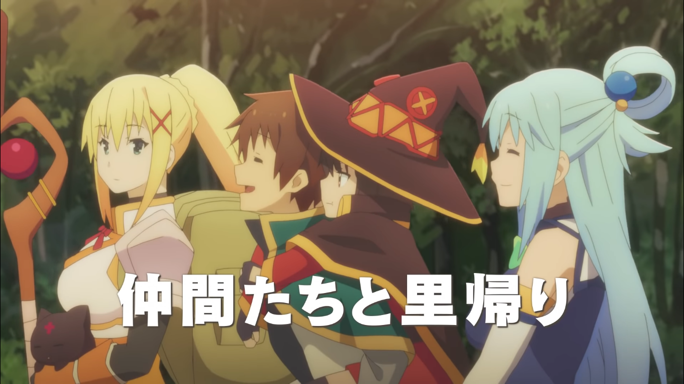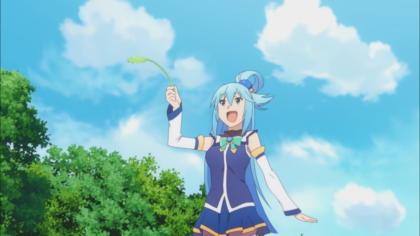 Вуаля! И вот они оказываются в фантастическом мире. Но очень скоро Сато приходится пожалеть, что в свои приключения он взял с собой Акву. Как выяснилось, дамочка не блещет ни умом, ни смекалкой.